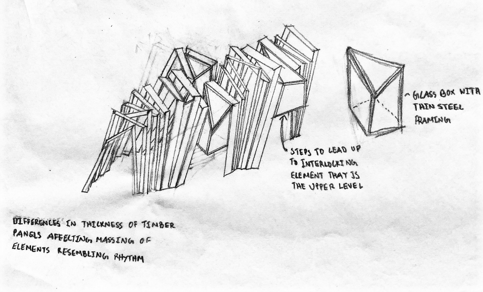 Using rhythmic elements in different massing, transition to an upper platform portraying different user experience through the use of different materials, in which the elements appear solid rather than the rhythmic voids below